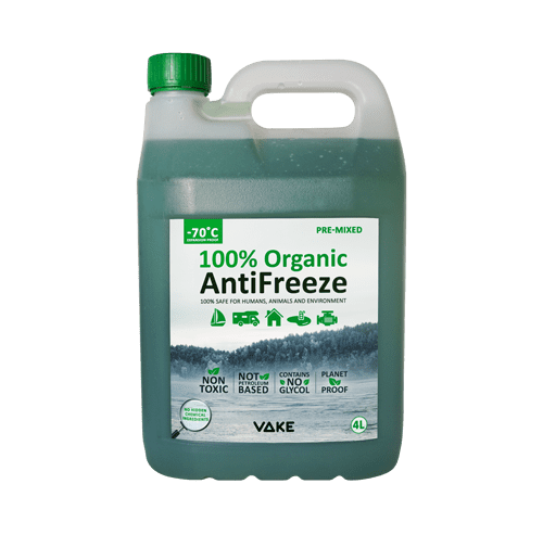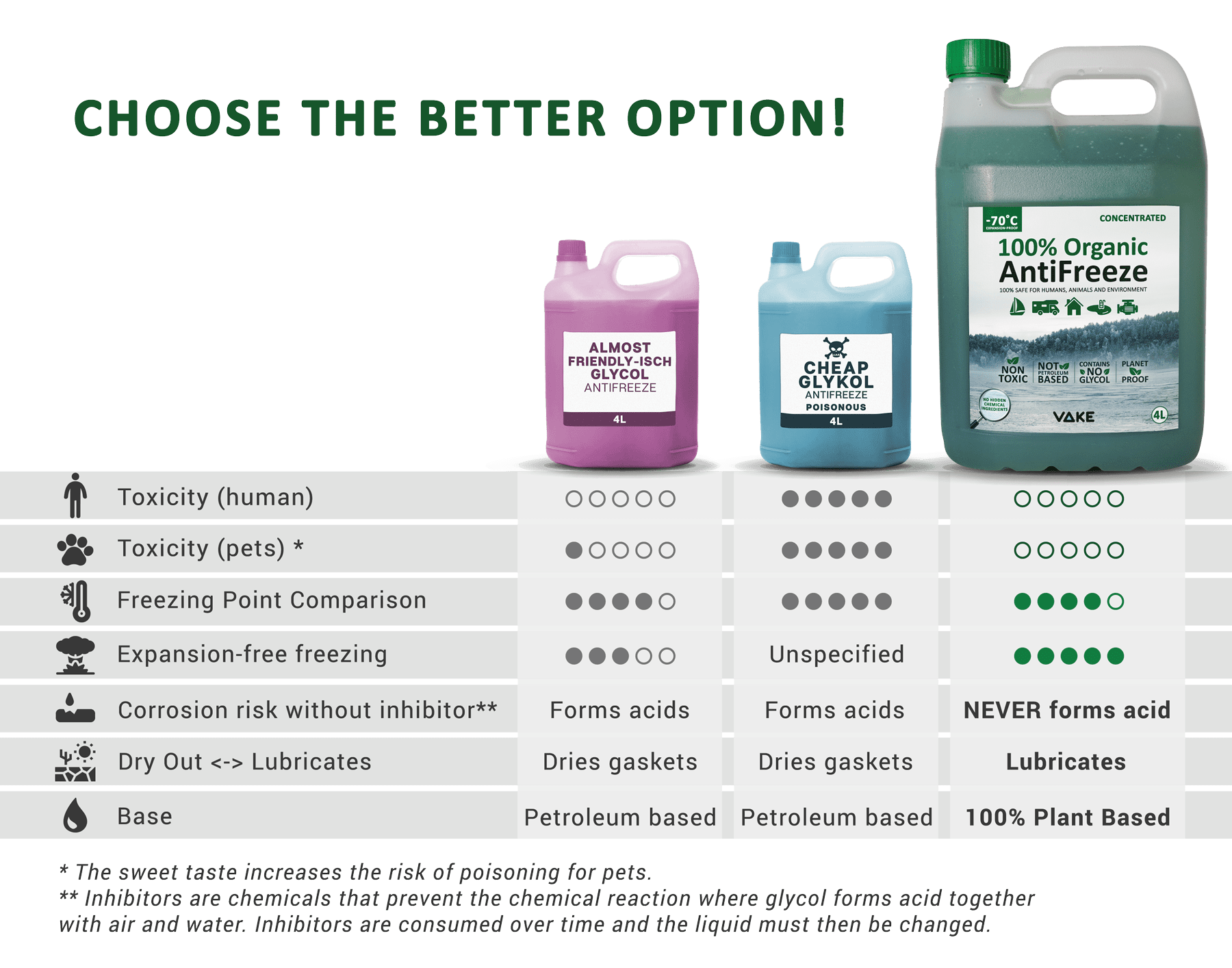Choose VAKE 100% Organic Antifreeze instead! It is produced under strict controls with plant based origin. It is completely safe for people, animals, and the environment. Freezing temperature is similar to what you are used to but it is also expansion-proof down to